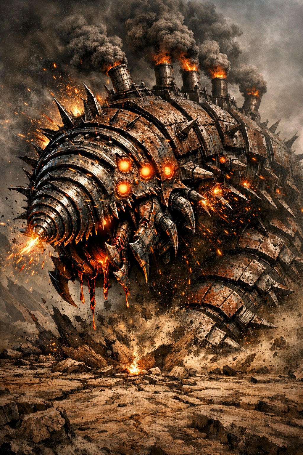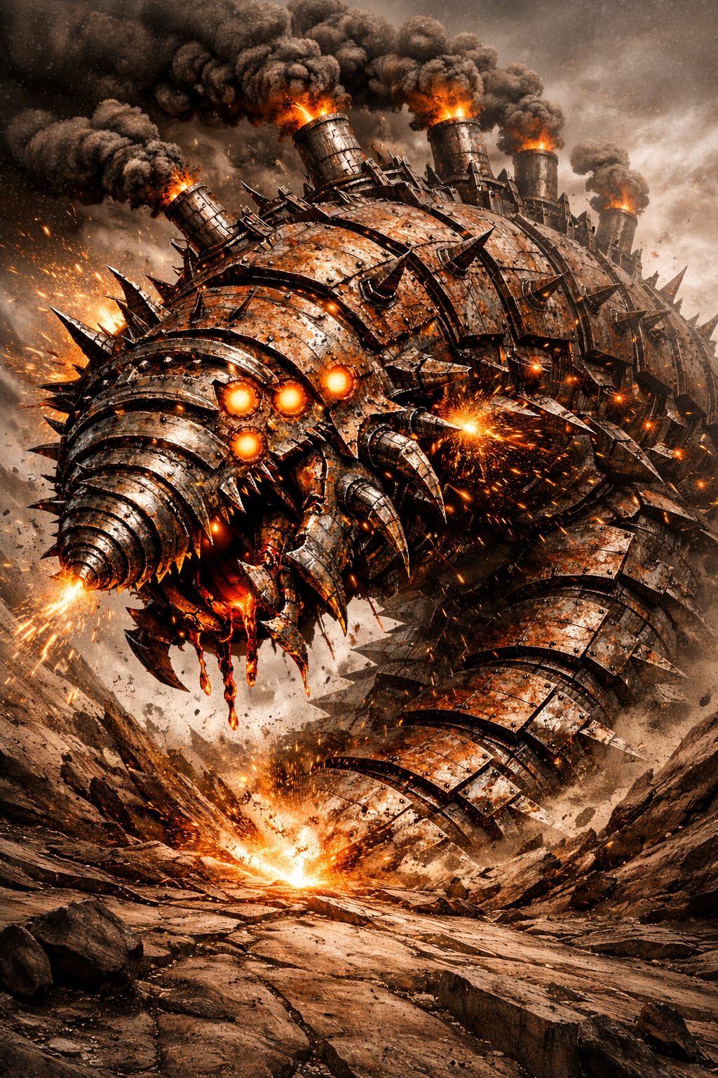 Ogromny, pancerny robal długości autobusu, którego ciało składa się z segmentów przypominających zardzewiałe płyty czołgu. Każdy ruch powoduje metaliczny zgrzyt i iskry sypiące się spod jego kolców.
